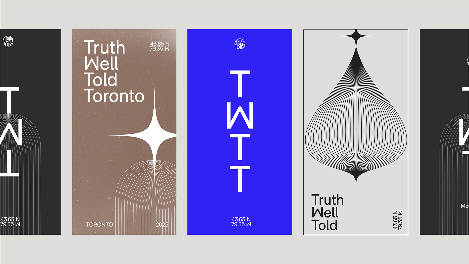 The result was a clean, flexible design language that combined typography, motion, and generative graphic forms inspired by ideas of truth, perception, and discovery—anchored in subtle references to Toronto as the host city. The system was applied across a wide range of touchpoints, including environmental graphics, wayfinding and welcome signage, digital screens and apps used to guide attendees, printed communications, and event collateral such as tote bags, bottles, and coasters.